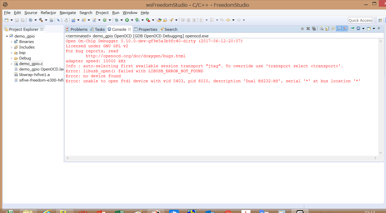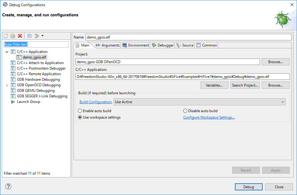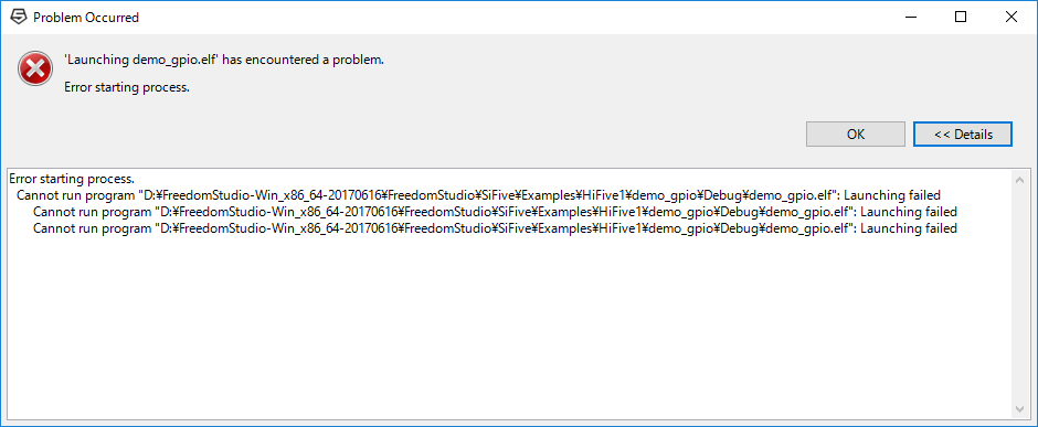 Deleails: Error starting process. Cannot run program “D:\FreedomStudio-Win_x86_64-20170616\FreedomStudio\SiFive\Examples\HiFive1\demo_gpio\Debug\demo_gpio.elf”: Launching failed Cannot run program “D:\FreedomStudio-Win_x86_64-20170616\FreedomStudio\SiFive\Examples\HiFive1\demo_gpio\Debug\demo_gpio.elf”: Launching failed Cannot run program “D:\FreedomStudio-Win_x86_64-20170616\FreedomStudio\SiFive\Examples\HiFive1\demo_gpio\Debug\demo_gpio.elf”: Launching failed